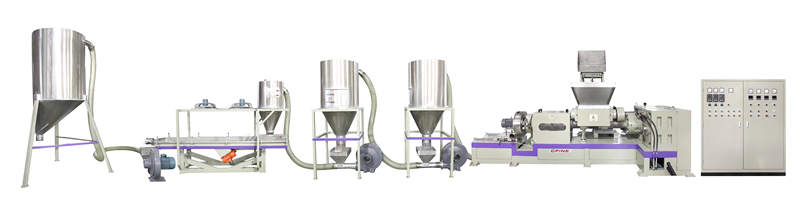 此機臺用于PVC,EVA,TPR等塑膠原料的生產(chǎn),包括主機,雙腕入料,模頭切粒等系統(tǒng)將密煉機攪拌好的原料經(jīng)雙腕擠入造粒機內(nèi)經(jīng)螺桿擠出后切成粒子,此機臺操作簡單